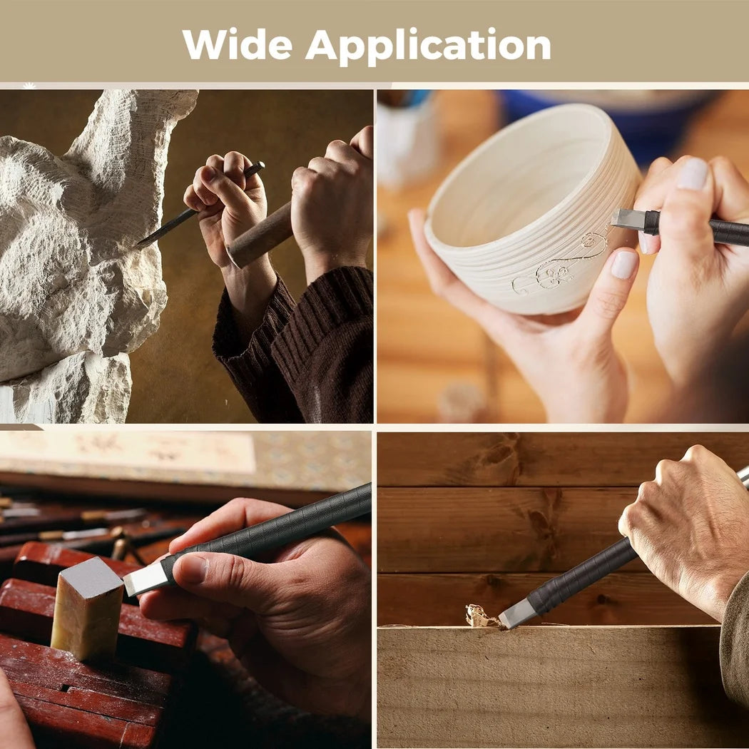 - Wide Application: This tungsten steel chisel set can be used for carving alabaster, limestone, calcite, fluorite, slate, wood, bamboo, plastic, and other materials, suitable for wood carving, stone carving, bamboo carving, mud carving, seal engraving, etc.
